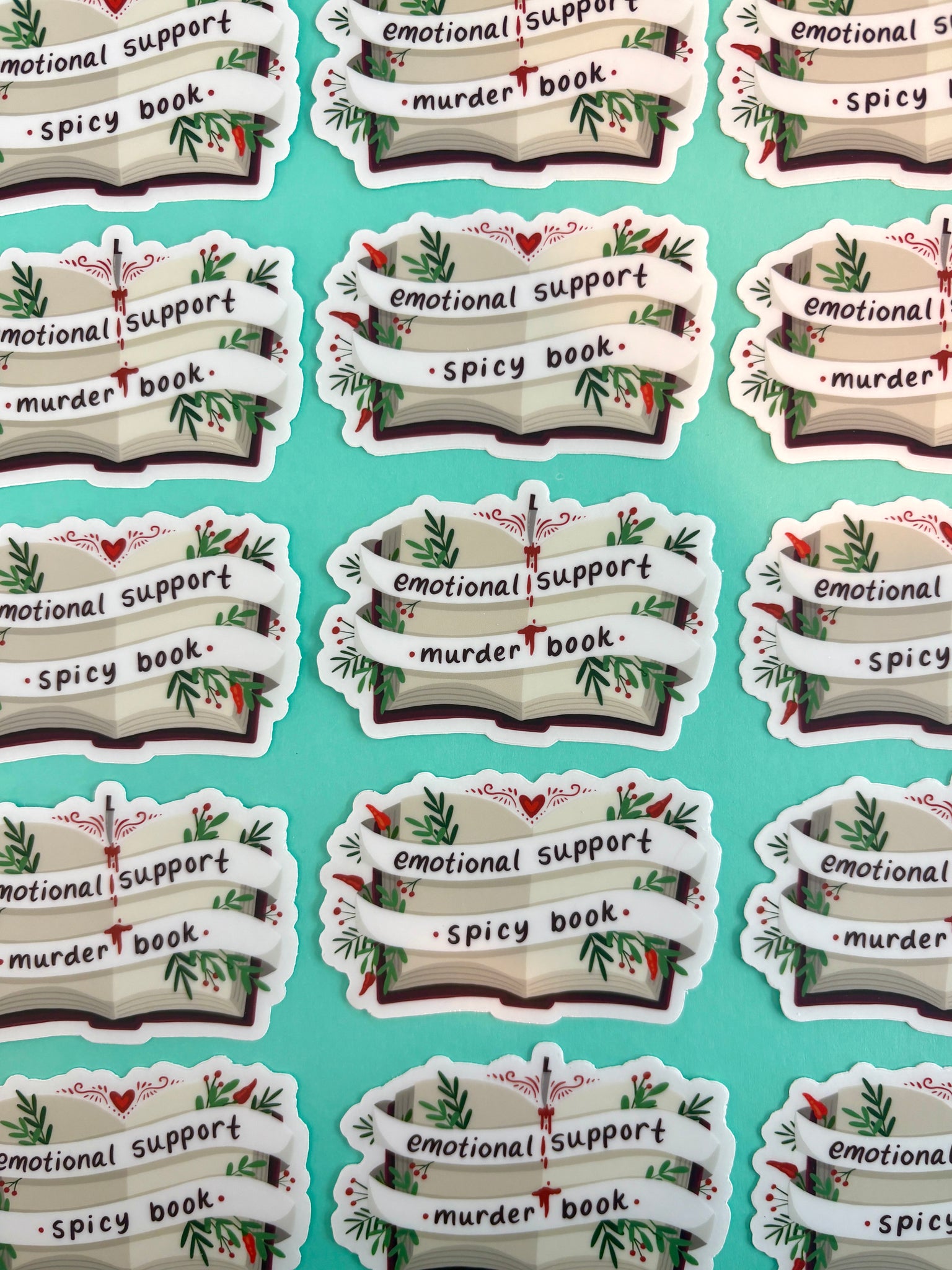 We all need an emotional support murder book in our lives. Stickee is approximately 3”x 3” and waterproof.